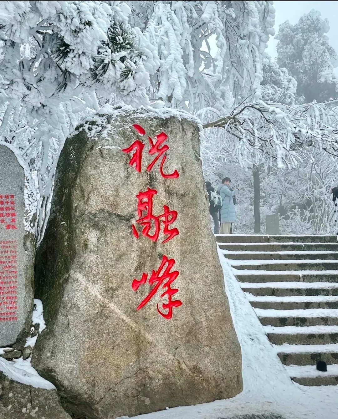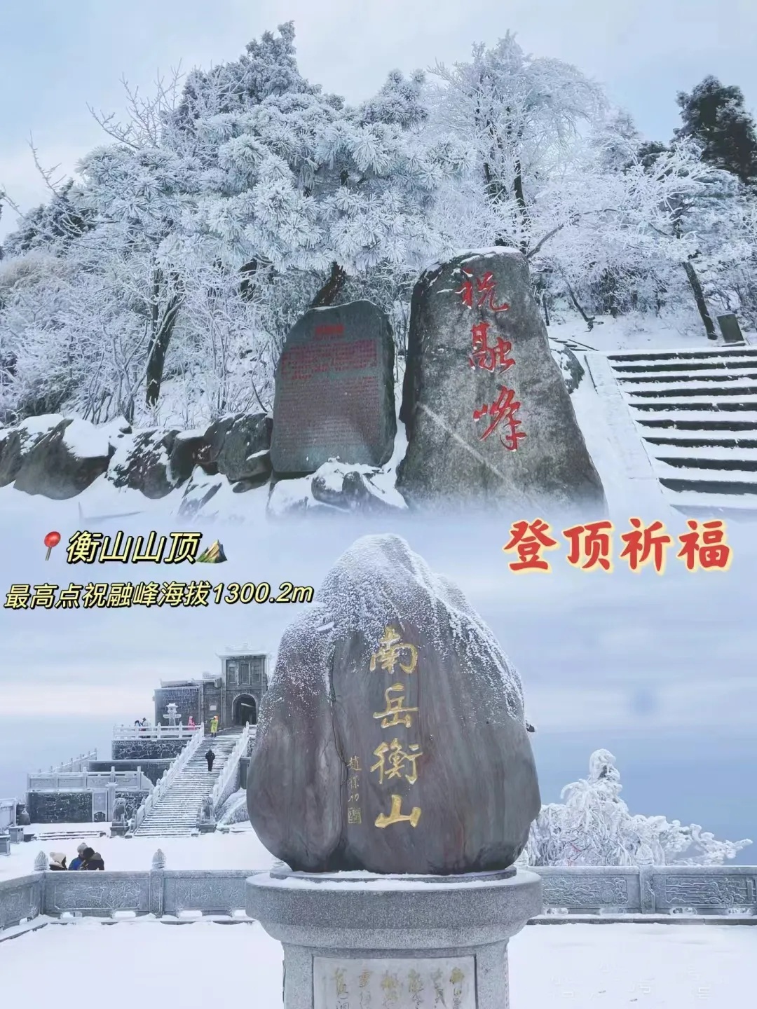 在祝融峰观冰赏雪是别有趣味的,山顶雪花飞舞,银妆素裹,山腰玉树环枝,晶莹欲滴,山下则一片青绿,是南国特色的雪景。